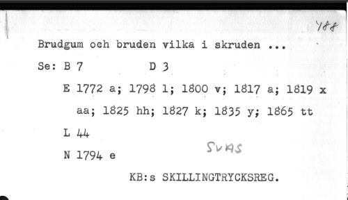 //// Brudgum och bruden vilka i skruden ... //// Se: B 7 D 3 ' //// * " ' . //// E 1772 a; 1793 1; 1600 v; 1317 a; 1319 x //// * * * . ; //// aa; 1325 hh; 1327 k; 1335 y; 1365 tt //// L 44 //// N 1794 e //// KB:s SKILLINGTRYCKSREG. //// E //// < //// F ////