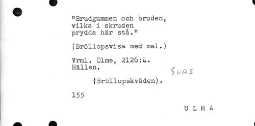 //// "Brudgummen och bruden, //// vilka i skruden //// prydda här stå." //// (Bröllopsvisa med mel.) //// Vrml. ölme, 2126:4. //// Milen. ^ //// {Bröllopskväden). //// 155 //// ULMA ////