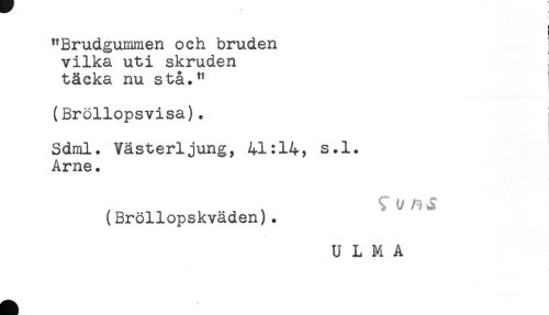 //// "Brudgummen och bruden //// vilka uti skruden //// täcka nu stå." //// (Bröllopsvisa). //// ! //// Sdml. Västerljung, 41:14, s.l. //// Arne. //// , t //// (Bröllopskväden). //// U L M A ////