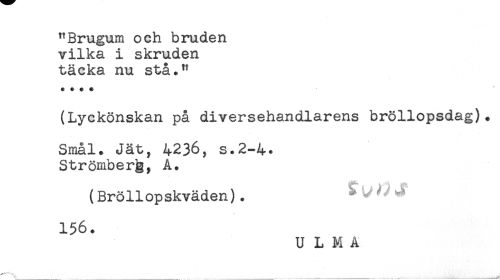 //// "Brugum och bruden //// vilka i skruden //// täcka nu stå." //// * + * * //// (Lyckönskan på diversehandlarens bröllopsdag). //// Smål. Jät, 4236, s.2-4* //// Strömberg, Å. //// (Bröllopskväden). //// 156. //// U L M A //// ^ - _ _____.. .____ _____^ ////