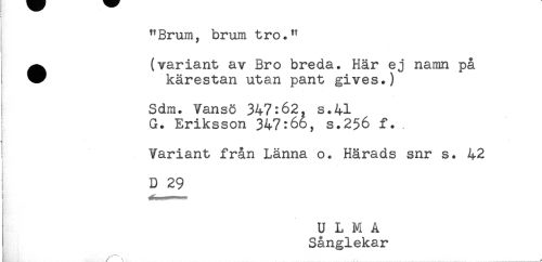 //// "Brum, brum tro." //// t //// ^ (variant av Bro breda. Här ej namn på //// W kärestan utan pant gives.) //// Sdm. Vansö 347:62, s.41 //// G. Eriksson 347:66, s.2$6 f.. //// Variant från Länna o. Härads snr s. 42 //// D 29 //// ULMA //// Sånglekar ////