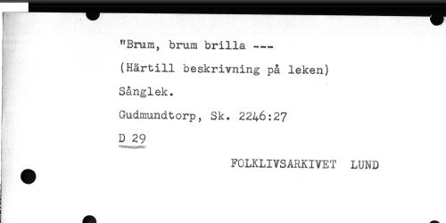 //// "Brum, brum brilla --- //// (Härtill beskrivning på leken) //// Sånglek. //// Gudmundtorp, Sk. 2246:27 //// D 29 //// FCLKLIVSARKIVET LUND ////