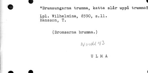 //// W "Brumsungarna trumma, katta siar uppa trumma? //// Lpl. Vilhelmina, 8590, s.ll. //// Hansson, T. //// (Bromsarna brumma.) //// U L M A ////