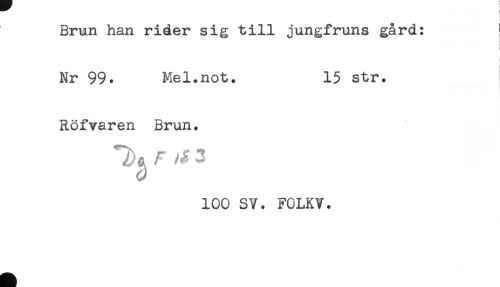 //// Brun han rider sig till jungiruns gard: ' //// < //// Nr 99. Mel.not. 15 str. //// Röfvaren Brun. //// 100 SV. FOLKV. ////