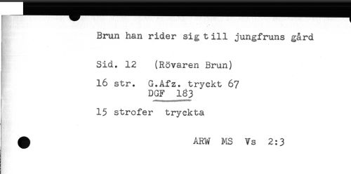 //// ! //// Brun han rider sig t ill jungfruns gård //// ' Sid. 12 (Rövaren Brun) //// 16 str. G.Afz. tryckt 67 //// DGF 163 //// 15 strofer tryckta //// ^ ARW MS Vs 2:3 ////