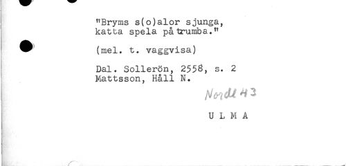 //// "Bryms s(o)alor sjunga, //// katta spela påtrumba." //// ^ (mel. t. vaggvisa) //// Dal. Sollerön, 2558, s. 2 //// Mattsson, Håll N. //// U L M A ////