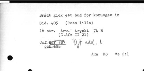//// - ... . , //// . //// Brådt gick ett bud för konungen in //// Sid. 405 (Rosa lilla) //// 16 str. Arv/, tryckt 74 B //// (G.Afz II 21) //// Jmf OgF^3ä7 f . \ //// ^ ARW MS Vs 2:1 ////