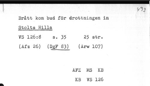 //// < //// -.' ! //// Brått kom bud för drottningen in //// i //// Stolts Hilla //// VS 126:8 s. 35 25 str. //// (Afz 26) (DgF 83) (Arw 107) //// AFZ MS KB //// KB VS 126 ////