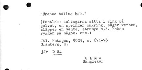 //// "Bränna bällta bak." //// (Pantlek: deltagarna sitta i ring på //// golvet, en springer omkring, såger versen, //// släpper en vante, strumpa o.d. bakom //// ryggen på någon, etc.) //// Jtl. Hotagen, 9925, s. 674-76 //// Granberg, E. //// jfr D 84 //// U L M A //// Sånglekar ////