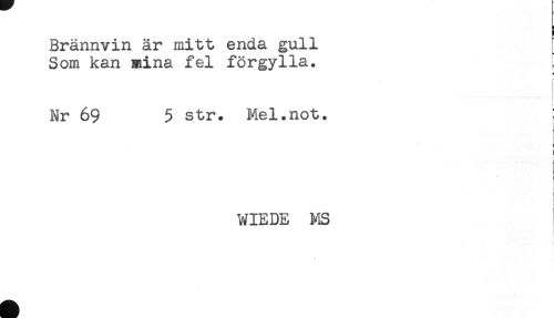 //// i //// Brännvin är mitt enda gull //// Som kan mina fel förgylla. //// a //// Nr 69 5 str. Mel.not. //// < //// ! //// i //// WIEDE MS ////
