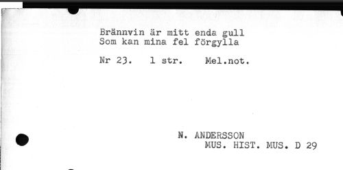 //// Hv' //// ! //// Brännvin är mitt enda gull //// Som kan mina fel förgylla //// Nr 23. 1 str. Mel.not. //// ^ N. ANDERSSON //// ^ MUS. HIST. MUS. D 29 ////