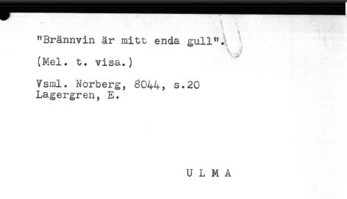 //// "Brännvin är mitt enda gull".^ //// (Mel. t. visa.) //// Vsml. Norberg, 8044, s.20 //// Lagergren, E. //// U L M A ////