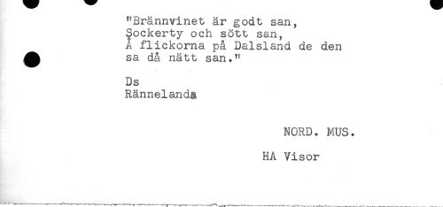 //// -Drannvine^ ar goa^ san, //// Sockerty och sött san, //// Å flickorna på Dalsland de den //// ^ sa då nätt san." //// Ds //// Ränneland§ //// NORD. MUS. //// HA Visor //// — r^—-----—_____.. . ////