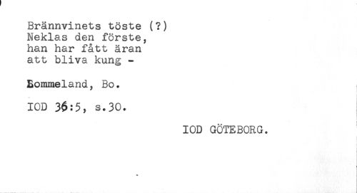 //// Brännvinets töste (?) //// Neklas den förste, //// han har fått äran //// att bliva kung - //// Eommelandy Bo. //// IOD 3$:5, s.30. //// IOD GÖTEBORG. //// < ////