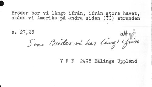 //// Bröder bor vi långt ifrån, ifrån stora havet, //// skåda vi Amerika på andra sidan (?f) stranden ; //// * //// S. 27,2g } //// I //// * //// V F F 2498 Bälinge Uppland //// ) ////
