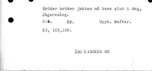 //// Bröder bröder jakten må bara slut i dag, //// c. ^' //// Jägaresång. //// ^ 2:4. KH. Uppt. Wefvar. //// R3, 165,106. //// ÅBO R ANCKEN MS ////