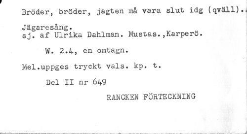 //// AJA^^A, ---- --- ---^ //// ! //// ; //// Jägaresång. //// sj. af Ulrika Dahlman. Mustas.,Karperö. //// W. 2.4, en omtagn. //// t i //// : //// Mel.uppges tryckt vals. kp. t. //// Del II nr 649 //// RANCKEN FÖRTECKNING //// . ' J ////
