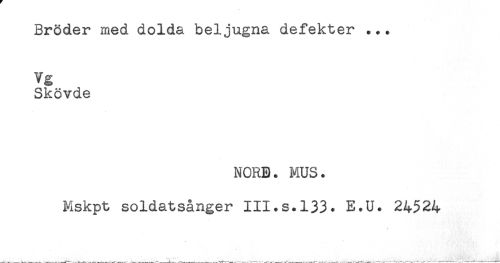 //// Broder med dolda oeijugna delekter ... //// Vg //// Skövde //// NORB. MUS. //// Mskpt soldatsånger III.s.133. E.U. 24524 ////