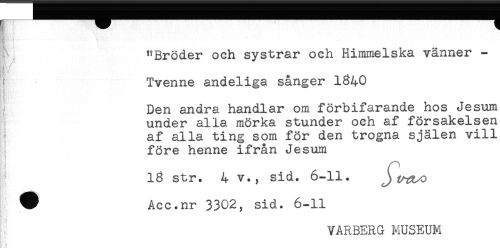 //// t ^ "Bröder och systrar och Himmelska vänner - //// i ? //// ^ Tvenne andeliga sånger 1340 //// i //// Den andra handlar om förbifarande hos Jesum //// under alla mörka stunder och af försakelsen //// af alla ting som för den trogna själen vill //// före henne ifrån Jesum //// 18 str. 4 v., sid. 6-11. Jtra^o //// ^ Acc.nr 3302, sid. 6-11 //// VARBERG MUSEUM //// [ * ////