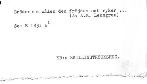 //// Bröder se bålen den fröjdas och ryker ... //// (Av A.M. Lenngren) //// + //// Se: E 1831 h^ //// ) //// ! //// t //// KB:s SKILLINGTRYCKSREG. //// - < *. ////