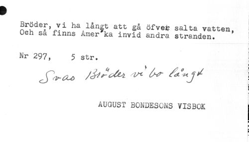 //// Bröder vi ha långt att gå öfve* salta vatten, //// Och sa finns Amer ka invid andra stranden. //// 't //// Nr 297, 5 str. //// t //// j //// ) //// AUGUST BONDESONS VISBOK //// H //// 5 ////