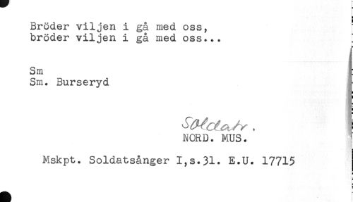 //// Bröder viljen i gå med oss, " //// bröder viljen i gå med oss... ; //// Sm t //// Sm. 3urseryd ^ //// * //// NORD. MUS. I //// i //// . //// Mskpt. Soldatsånger I,s.31. E.U. 17715 //// i //// H //// § ////