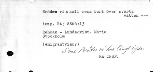 //// Brödca vi s kall resa bort över svarta //// vatten --- //// insp. Rtj 8866:13 //// Rehman - Lundeqvist. Maria //// Stockholm //// (emigrantvisor) //// ^ RA INSP. //// * ////