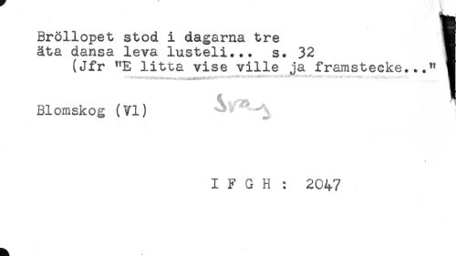 //// Bröllopet stod i dagarna tre H //// äta dansa leva lusteli... s. 32 H //// (Jfr "E litca vise ville ja framstecke..." § //// Blomskog (VI) //// * //// I F G H : 2047 ////