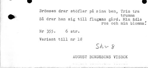 //// Bromsen drar stöflar på sina ben, Trin tra //// ^^ trumma //// ^^ Så drar han sig till flugans gård. Min ädla //// ros och min blommat //// Nr 355* 6 str. //// Variant till nr 18 //// AUGUST BONDESONS VISBOK ////