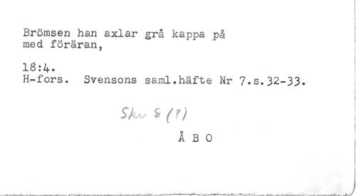 //// Bromsen han axlar grå kappa på //// med föräran, //// 16:4. //// H-fors. Svensons saml.häfte Nr 7.s.32-33. //// t //// < //// ÅBO ////