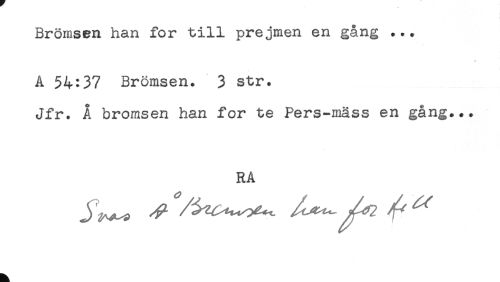 //// Bromsen han for till prejmen en gang ... //// A $4^37 Bromsen. 3 str. //// Jfr. Å bromsen han for te Pers-mäss en gång... //// RA //// J ^ /L^ ^^ ////