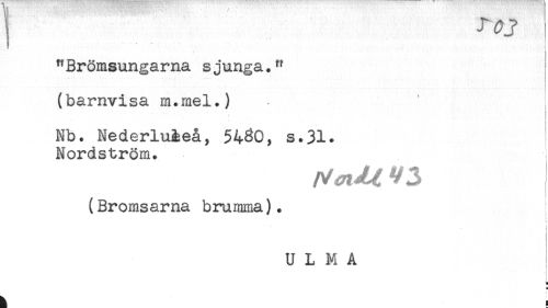 //// T //// t //// " Brömsungarna s junga." //// (barnvisa m.mel.) . ! //// Nb. Nederluåeå, 54^0, s.31. //// Nordström. //// (Bromsarna brumma). ! //// i //// r //// 'H ////