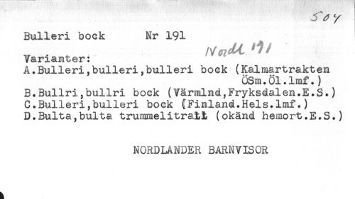 //// ^ ^ //// /Bulleri bock Nr 191 //// Varianter: //// A.Bulleri,bulleri,bulleri bock (Kalmartrakten //// 0Sm.01.lmf.) //// B.Bullri,bullri bock (Värmlnd,Fryksdalen.E.S.) //// C.Bulleri,bulleri bock (Finland.Hels.Imf.) //// D.Bulta,bulta trummelitratt (okänd hemort.E.S.) //// NORDLANDER BARNVISOR ////