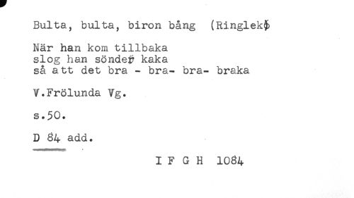 //// Bulta, bulta, biron bång (Ringlek^ //// När han kom tillbaka //// slog han söndei? kaka //// så att det bra - bra- bra- braka //// V.Frölunda Vg. //// s.50. //// D 84 add. ////