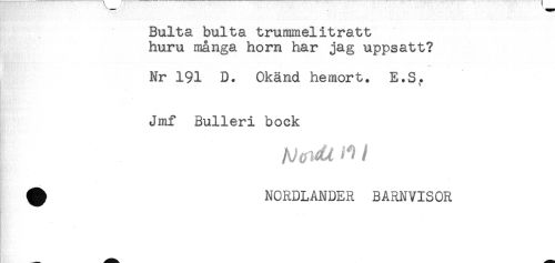 //// Bulta bulta trummelitratt //// huru många horn har jag uppsatt? //// Nr 191 D. Okänd hemort. E.S. //// * //// Jmf Bulleri bock //// ^ NORDLANDER BARNVISOR //// - ////