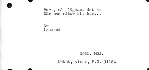 //// Burr, så plågsamt det är //// När man råkar bli kär... //// Dr //// Leksand //// NORD. MUS. //// Mskpt, visor, E.U. 31184 ////