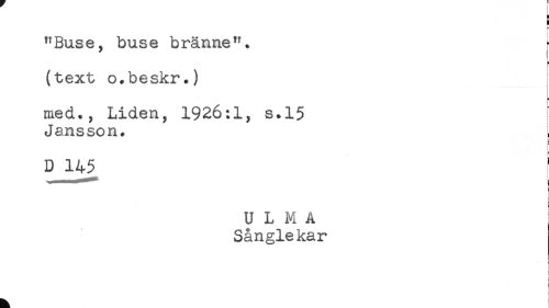 //// "Buse, buse bränne". //// (text o.beskr.) //// med., Liden, 1926:1, s.15 //// Jansson. //// D 145 ^ //// U L M A //// Sånglekar ////