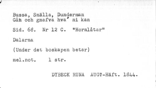 //// Bussa, Snälla, Dunderman //// Gåh och gnafva hva* ni kan //// Sid. 68. Nr 12 C. "Hornlåtar" //// Dalarna //// ! //// (Under det boskapen betar) //// t //// mel.not. 1 str. //// ! //// ) //// t //// DYBECK RUNA AUGY-Häft. 1844. ' //// i ////