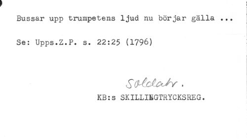 //// Bussar upp trumpetens ljud nu börjar gälla ... //// Se: Upps.Z.P. s. 22:25 (1796) //// i //// KB:s SKILLINGTRYCKSREG. ////