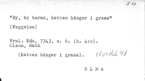 //// "By, by barna, katten hänger i grana" //// (Vaggvisa) //// Vrml. Eda, 7343, s. 6. (h. 4:o). //// Olson, Math //// t //// (Katten hänger i grana). ////