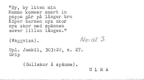 //// Dy y uy JLJL U A iiiJ-H //// Mamma kommer snart in //// pappa går på långer bro //// Köper barnen nya skor //// nya skor med spännen //// sover lillan längen." //// (Vaggvisa). ^ 3 //// Upl. Jumkil, 303:22, s. 27. //// Grip //// (Gullskor å spänne). ////