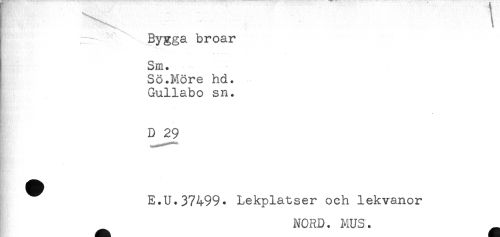 //// Bygga broar //// * * .. //// Sm. //// ! Sö.Möre hd. //// Gullabo sn. //// D 29 //// ^ E.U.37499* Lekplatser och lekvanor //// NORD. MUS. ////
