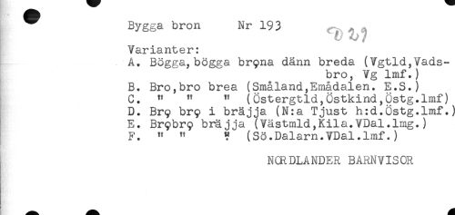 //// ^ Bygga bron Nr 193 //// Varianter: //// A. Bögga,bögga bryna dänn breda (Vgtld,Vads- //// bro, Vg lmf.) //// B. Bro,bro brea (Småland,Smådalen. E.S.) //// C. " " " (Östergtld,Östkind,Östg.lmf) //// D. Bry bry i bräjja (N:a Tjust h:d.Östg.lmf.) //// E. Brybry bräjja (Västmld,Kila.VDal.lmg.) //// F. " " ? (Sö.Dalarn.VDal.lmf.) //// NCRDLANDER BARNVISOR ////