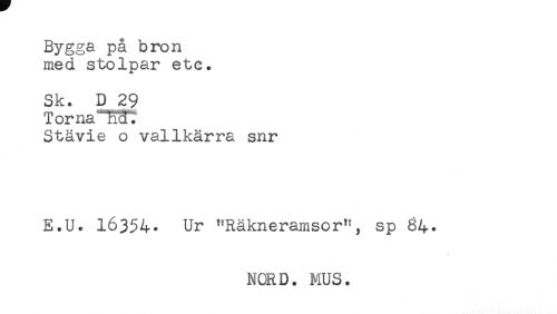 //// Bygga pa bron //// med stolpar etc. //// Sk. D 29 //// Torna^^Wl //// Stävie o vallkärra snr //// E.U. 16354. Ur "Räkneramsor"; sp 84. ////