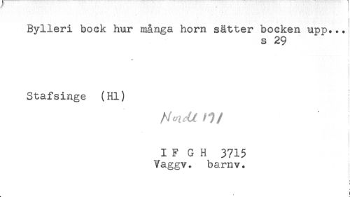 //// Bylleri bock hur många horn sätter bocken upp... //// s 29 //// t //// < //// * ! //// t //// t //// i //// Stafsinge (Hl) ; //// I F G H 3715 //// Vaggv. barnv. i //// r //// L. - ////