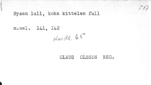//// ! j ^^ //// Bysan lull, koka kittelen full //// m.mel. 141, 142 //// /V ^ ^ ^ ^ //// OLAUS OLSSON REG. ////