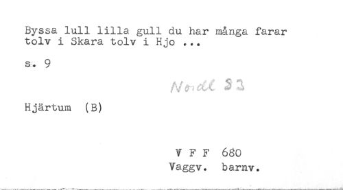 //// Byssa lull lilla gull du har många farar //// tolv i Skara tolv i Hjo ... //// s* 9 //// Hjärtum (B) ////