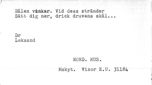 //// Bålen v&nkar. Vid dess stränder //// Sätt dig ner, drick druvans skål... //// t //// Dr //// Leksand //// t //// NORD. MUS. //// Mskpt. Visor E.U. 31184 ' //// L ////