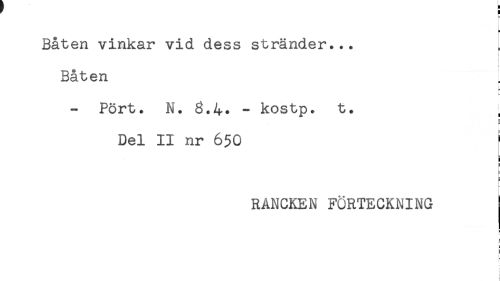 //// Båten vinkar vid dess stränder... //// Båten //// - Pört. N. 8.4. - kostp. t. //// Del II nr 650 //// i //// = //// r //// [ //// L //// RANCKEN FÖRTECKNING ////