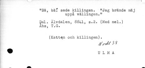 //// "Bä, bäf sade killingen. "Jag brände mäj //// uppå vällingen." //// Dal. Älvdalen, 6841, s.2. (Med mel.) //// Åhs, T.G. //// ) //// (Kattqn och killingen). //// ^ U L M A //// * ////